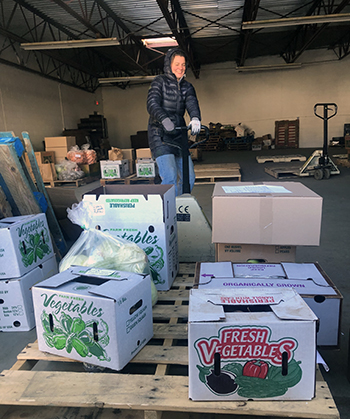 Northwest Connecticut Food Hub Director Renee Giroux moving a pallet of regionally grown produce dropped off by farmers, agregated, and prepared for outgoing delivery to food access organizations.