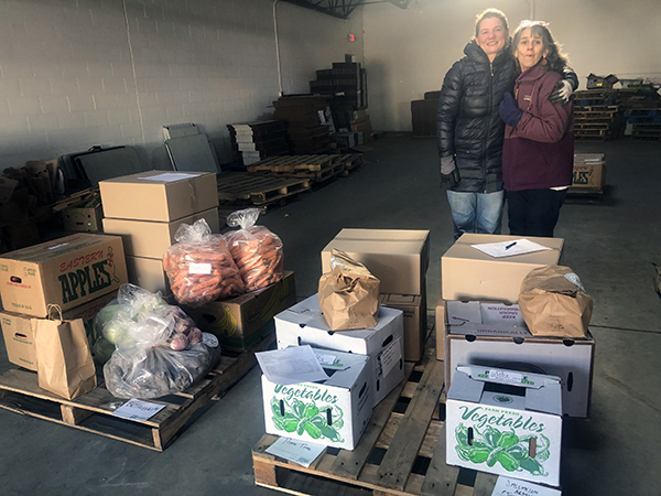 Renee Giroux and Susan Zappulla-Peters with pallets of produce aggregated from different regional farms and prepared for deliveries to local food access organizations.