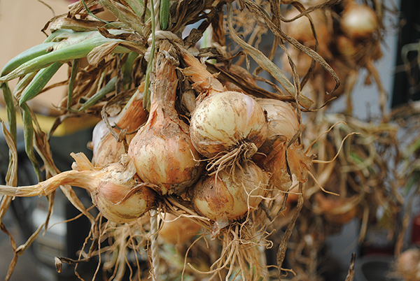Yellow potato onions hanging to cure. Photo by Southern Exposure Seed Exchange.
