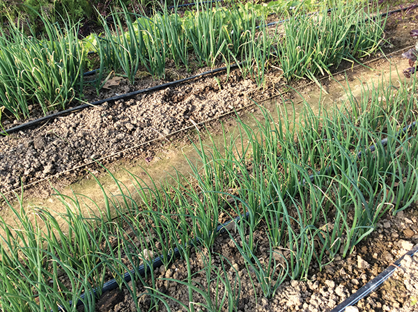 Onions transplanted in early spring from the hoophouse. Photo by Kathryn Simmons.