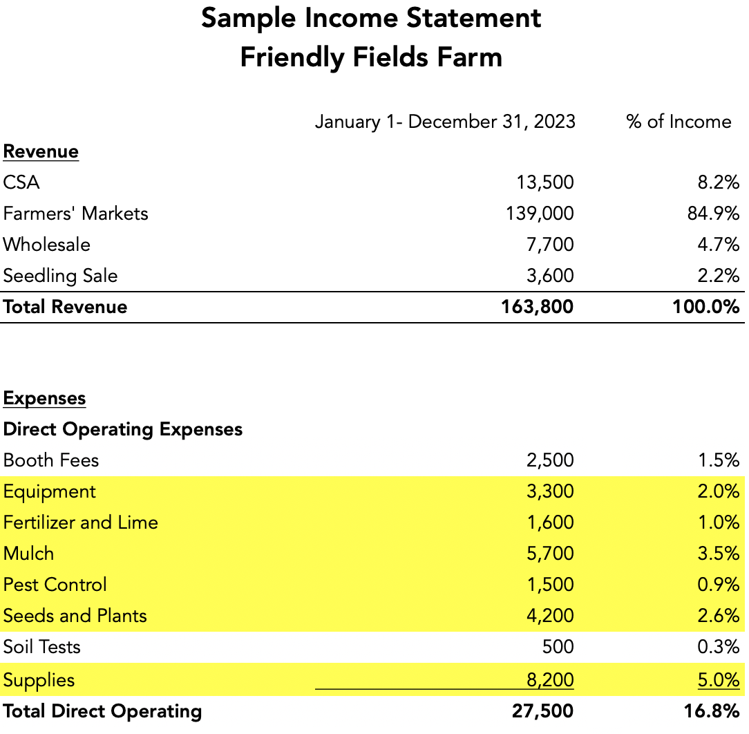 Your production costs can be seeds, greenhouse supplies, field supplies, and labor. For the purposes of cash flow planning, you can expect that as revenue and production increases, you will spend more on these line items. You will also have more credit card processing fees and packaging. If you’re using QuickBooks, you can run a profit and loss statement for last year, and add a column to look at expenses as a percentage of revenue.