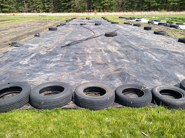 A 32’ by 105’ tarp folded to cover four beds instead of eight.