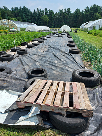 Tarping. The best resource and research on tarping can be found at the University of Maine’s Cooperative Extension, in particular Bulletin #1075 Tarping in the Northeast. Silage tarps cost about $0.10 a square foot. We use 32×105 foot tarps since we are often planting and harvesting in four-to-eight-bed units or cover cropping entire 12-bed blocks. We can easily move tarps to cover entire plots or fold the tarp to cover two, four or eight beds.