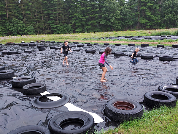 Tires are really easy to move and store neatly in rows. They also roll easily for placing and removing. We have a specific method of kicking to roll tires or “lift and bounce” a tire so they can roll up to 40 feet accurately. They almost never lay on soil surface so I am not concerned with leaching of tire residue. A tight tarp with edges overlapping by 1 foot minimum and with the prevailing wind direction in mind when overlapping makes a big difference in not having to “re-tarp.”
