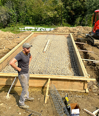 After leveling out the ground where the building would live, we built the frame and heavily braced it. We laid down stone and pieces of rebar that would offer additional strength. Our footing section ended up being about two feet deep, and the actual slab is four inches.