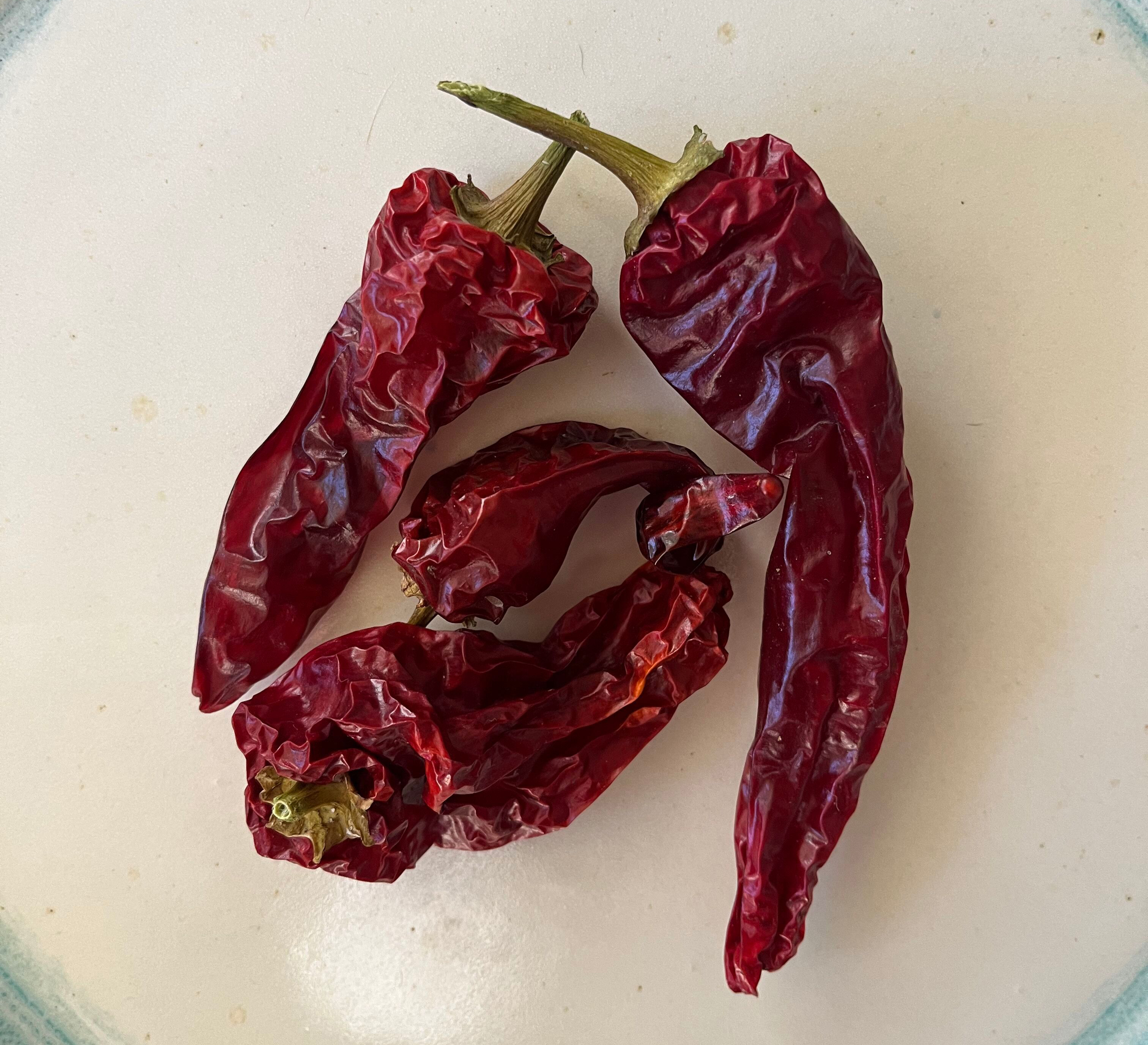Pictured here are dehydrated Chimayo chilies, a specialty pepper that hails from northern New Mexico and is sought out for culinary purposes.