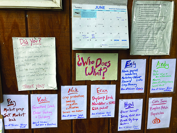 To function as a team, it’s important for all members to understand what everybody on the farm does. On an interior wall of the barn, I keep a communication hub of signs and clipboards. There are separate clipboards for time sheets for volunteers, interns, and employees, along with posters with Food Safety and Employment Safety policies, a calendar for special activities and time off, and “Who Does What?” sheets.