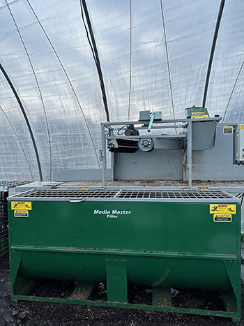 Ultimately, we went with Nolt’s Media Master™ Pot and Flat Filler. It can hold three 3.8-cubic-feet compressed bales at a time, which is just right for our needs. It not only breaks up the bales and lets you add water, but also has a flat filling function to fill trays — essentially two machines in one. The machine is built in Pennsylvania by a guy named Wilmer, whose phone number is in the Nolt’s catalog and who answered all of our questions. Nolt’s also has some website videos of how to use the machine.