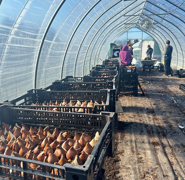 We combined the flat filler with basic conveyor belts we found on Facebook marketplace for a seamless tulip planting “factory.”