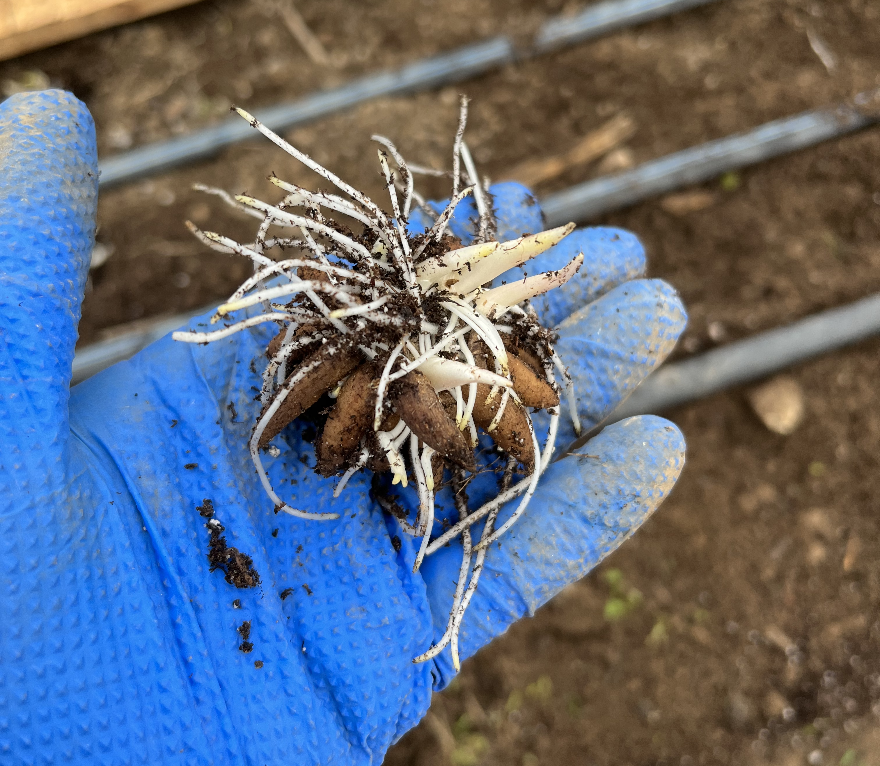I took a hard look at every step in this process, and shortened or simplified every step I could. Now, we grow them by soaking the corms, then dumping them into a 1020 flat, covering them with a bit of soil, and letting them pre-sprout for about seven to ten days in the greenhouse. Finally, we transplant them as pre-sprouted corms, which are much quicker to transplant than big-fat, 50-cell plugs.