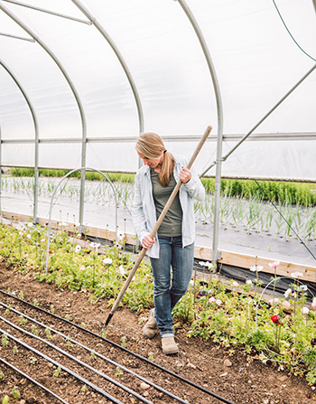 The author cultivating in her greenhouse. Have a system in place to scout for weeds weekly and they should never get out hand.