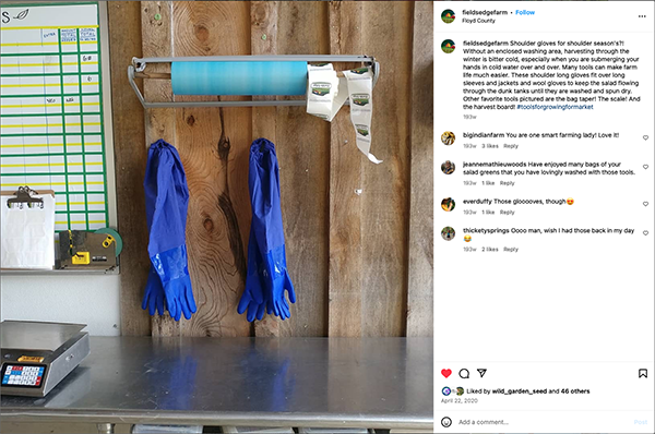 Scrolling back through all of the photos tagged #toolsforgrowingformarket on Instagram I found a post of some long gauntlet gloves hanging in a packing shed that was posted by Kat Johnson when she was manager of @fieldsedgefarm back in 2020 (I also wrote up Kat’s pocket magnet knife holder in this column a few years ago).