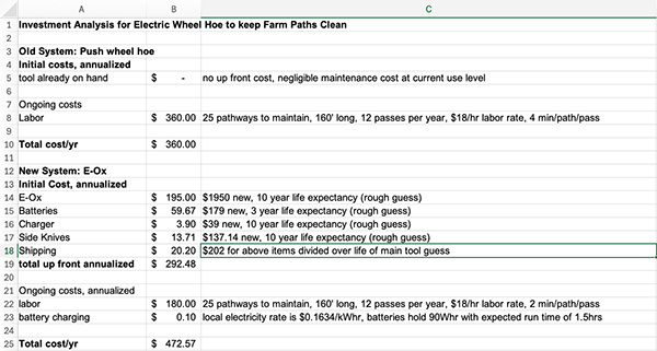 It is always worth taking a second look at all of your numbers, estimates, and assumptions, thinking about how good they are, and perhaps running a few more scenarios. For example, I’m assuming here that I would only be using the E-Ox for cleaning paths on the farm, and it’s possible that I might also use it for other tasks in which case I should include those in the analysis. Are my estimates of how long it takes to use the wheel hoe, versus how long it will take with the E-Ox good, or might there be a bigger difference? Is that actually the number of passes I need to make to keep the paths clean? Is there extra cost because I’ll need to build out a storage space for the new tool to keep it out of the weather when it’s not being used?