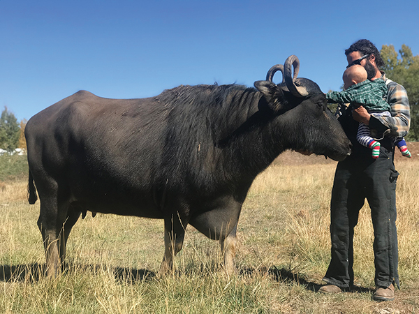 Jose Miranda with son and water buffalo on Rocking TT Bar Ranch in Augusta, Missouri.