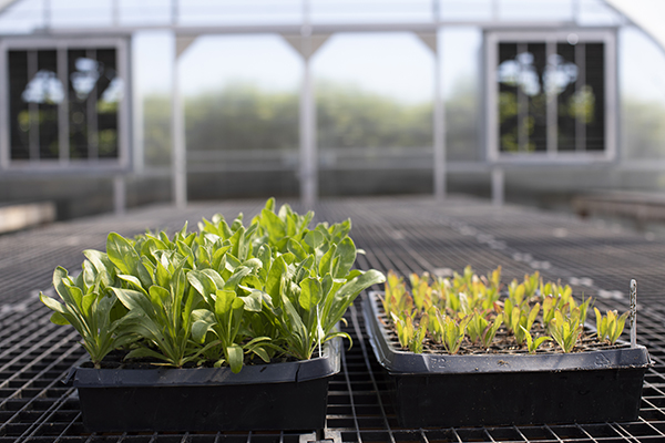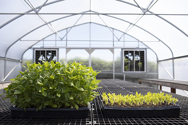 Above is a side-by-side comparison to independently test compost and granular fertility. A brassica variety was sown into seedling mix containing either: no additional fertility, compost alone, granular fertilizer alone, or compost and granular fertilizer in combination. This test showed a more significant contribution from the granular fertilizer in terms of vigor. Facing page: Careful observation of plant health in the greenhouse allows us to monitor the effects of any changes to our seedling mix or other aspects of the greenhouse program. Both photos by Chris Benzakein.