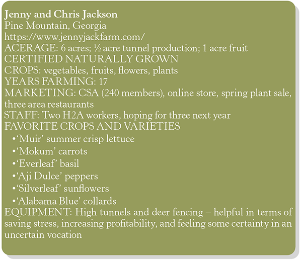The owners of Glover Family Farm, organic farming pioneers in Georgia, allowed them to work and learn on their farm even though they had recently retired from farming full-time then. They introduced Chris and Jenny to many other growers and organizations like Georgia Organics and Slow Food. In 2007, Jenny’s parents generously allowed them access to the land to start their farm.