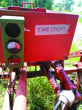Incorporating the record keeping into the everyday activities on the farm and placing little physical reminders in the places where the activities are done are two of the tips KYCTG gives for actually collecting the data you need to do your analysis. Importantly, it has you think this through and set it up before the season starts, helping ensure the records actually get recorded during the season when things are busy. Shown here is a little tape label on a cultivating tractor at Persephone Farm in Oregon. It reminds the driver every time they get on the seat of the tractor that they might need to record a time for whatever it is they’re about to do. Photo by Theo Ciszewski.