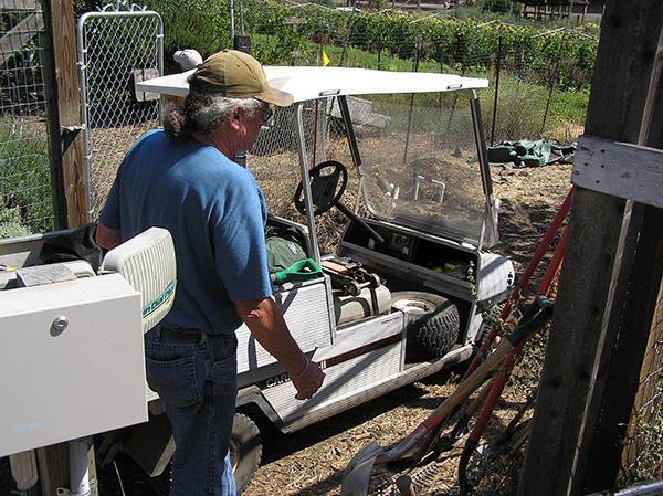 Andy Scott, the famer I apprenticed with standing next to one of the electric utility carts at Hidden Villa. The small size of these vehicles and low weight allows them to maneuver into tight spots on the farm.
