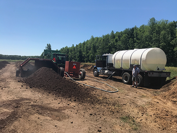 The author Increasing the moisture content of active compost windrows using a commercial water truck and a compost turner outfitted with a watering manifold.