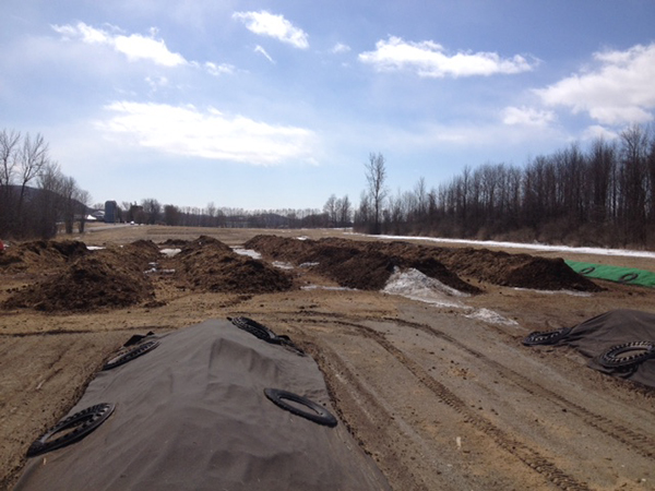 The author’s compost site with covered/protected finished compost in the foreground, and uncovered horse manure in the background that’s intentionally being exposed to rainfall and snowmelt.