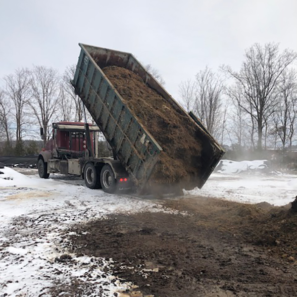 The author receiving a thirty cubic yard load of horse manure. After delivery, the manure is moved to into broad, short (in height) piles to maximize its exposure to rainfall and snowmelt. After four to eight months, it’s then mixed with wet dairy manure at a ratio of about two parts horse manure to one part dairy manure. All photos courtesy of the author.