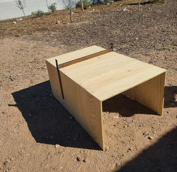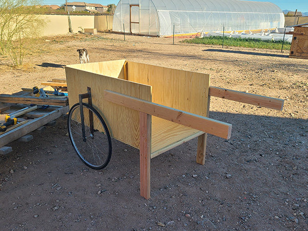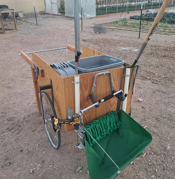 Tommie from Moonlighter Farm in Tucson, Arizona, posted a photo of the cart he built from scrap wood and metal. Moonlighter is a new farm, tiny sub-acre, one-man operation specializing in leafy greens and baby roots. Though the farm is new, Tommie spent a couple of years working on other operations and networking with growers in his area. The design of his cart is very similar in form to a typical garden cart with a low deck with tall sides and back. For Tommie the sides help to keep harvested greens in the shade while the desert sun is still low in the morning. The main difference between his cart design and a regular garden cart has to do with the width, and the wheel mounting method. The cart is designed to straddle his beds and to fit two Rubbermaid totes side by side. Instead of cart wheels that slide onto an axle he welded forks to hold used bicycle wheels and bolted those to the sides of the cart. He also attached mounts on the outside of the cart for carrying tools. The tubes for holding tool handles are made from 1 ¼” PVC pipe and a long carriage bolt through the bottom of the pipe prevents the handle from falling through, while leaving the pipe open enough to not collect dirt or water.