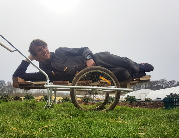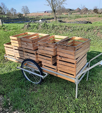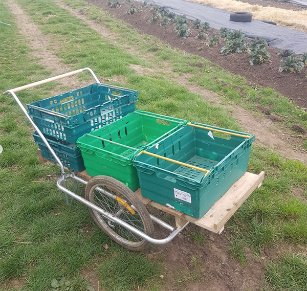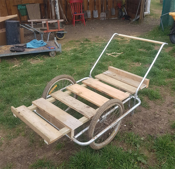 Jonathan from Taybank Growers Collective in the heart of Scotland posted photos of a very different cart they use on their farm, a bicycle trailer he converted into a hand cart. Again, this one has a low deck, but unlike Tommie’s cart there are no sides, just little cleats on the ends to keep bins from sliding off the frame. Simple aluminum frame bicycle trailers for hauling kids and groceries have become more common which means there are more of them out there on the used market, prime for making modifications, especially as the fabric enclosures wear before the aluminum. With only the addition of a wooden dowel for the handle and some extra screws Jonathan was able to repurpose the parts of the frame that had been for hooking the trailer to the bike to create the handle and feet. By his reporting ideally the handle would be stiffer, but it’s functional enough that they hadn’t felt the need to reinforce it immediately.