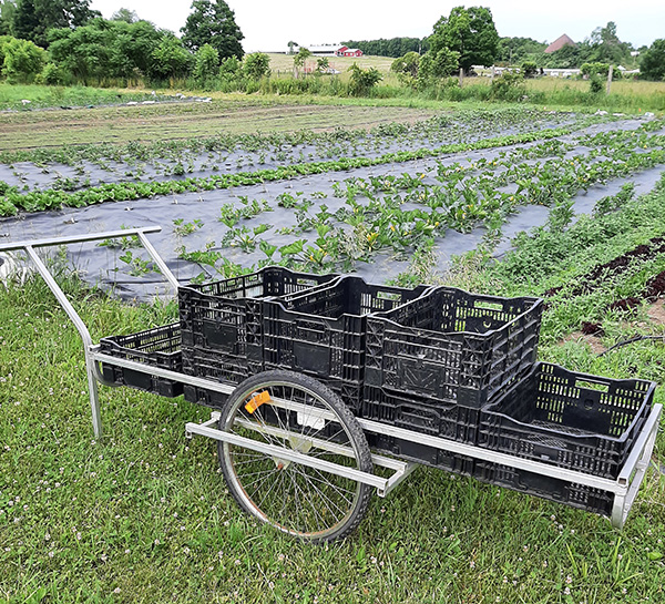 Thomas and Sarah Judd from Meadow Lynn farm in southwestern Ontario, Canada, posted a photo of a cart that is very similar in form to the modified cart that Jonathan made seven years ago. Theirs was welded together from aluminum square tube and is much longer. Because the cart is purpose built it snuggly fits the bulb crates they use for harvest, allowing five to be lined up on the bottom and for extras to be stacked on top of those. Sarah reports that with heavy crops like summer squash a single layer of bins is a comfortable load, but with bulkier crops like lettuce they can easily stack three high. The light weight of the aluminum tubing makes the cart very easy to handle.