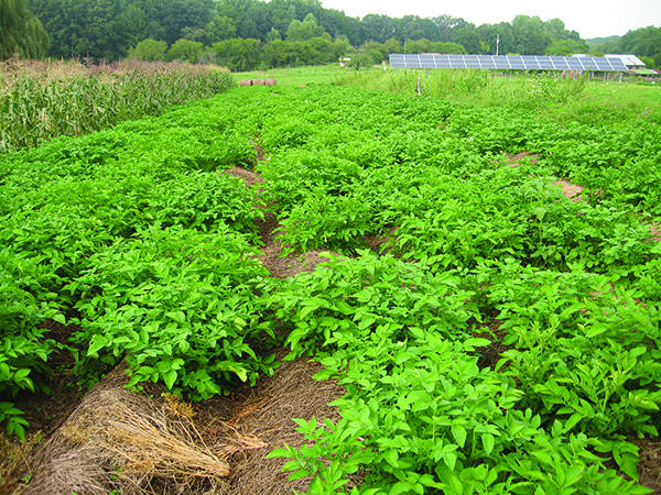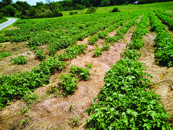 Potato patch mulched with hay in the summer. Photo by Pam Dawling.