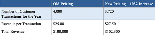 This year, you decide to raise your prices by 10% so your revenue would be $110,000 for the same amount of product, and the average transaction would be $27.50. If you lose 7% of your customers, then instead of having 4,000 transactions for the year, you will have 3,720. Your projected revenue would then be $102,300 (27.50 * 3,720)—still ahead of the previous year.