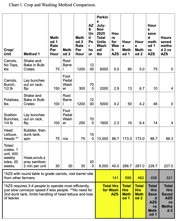 Chart 1: Crop and washing method comparison. The chart also reveals that investing in a foot-pedal washer ($600) and root-barrel washer ($3,800), for a $4,400 total investment would save 140 hours of labor with our current crop volume for example, making those items a good investment depending on your volume of crops and markets. Again, the volume and variety of crops we grow, plus the value of washing and sanitizing totes/bins/trays, was key in making the investment. I want to be able to farm well into old age and that starts by investing in the right now.