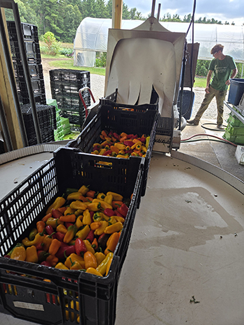Stage your veggies before washing so you spray the roots and keep them wet. Lay bunched items in a single plane on the conveyor to get the best washing. Also, harvest a single layer into a bulb crate — peppers, etc., so you are able to wash and then dump them into the final tote. It may require two run throughs or a spray at the end.