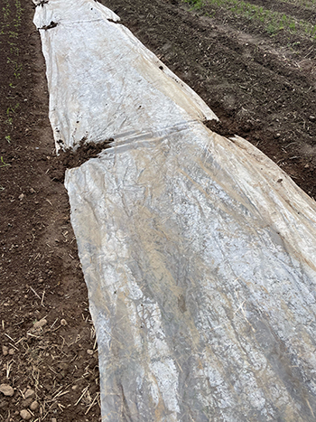 Here in the Pacific Northwest, we get a lot of overcast, damp days, and heavy, cold showers in the late winter and early spring – conditions that are particularly poor for germination of early direct seeded crops. Covering the soil with clear plastic helps warm the soil slightly, but I think just as importantly it keeps the soil near the surface, where the seeds are, at a consistent moisture level and prevents heavy, cold showers from washing out the seed. It’s important to remove the plastic as soon as the crop has germinated, especially if the sun comes out, as it’s easy to get the temperatures between the plastic and the soil up above a safe temperature for the cotyledons and to burn them.