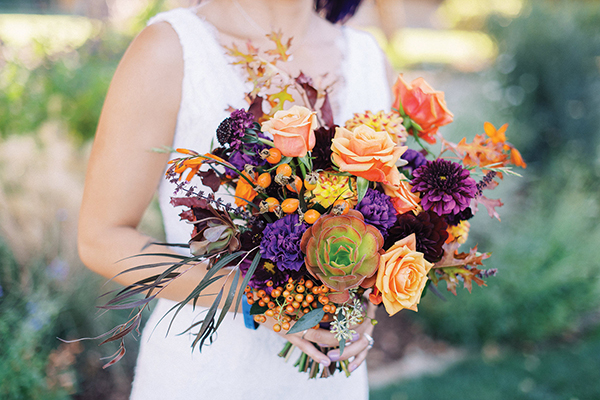 Beyond the pale- featuring garden roses, rose hips, echeveria, oak foliage, scabiosa and dahlias, this vivid wedding bouquet was designed by Margaret Lloyd of Santa Barbara-based Margaret Joan Florals. Photo by Grace Katherine Photography.