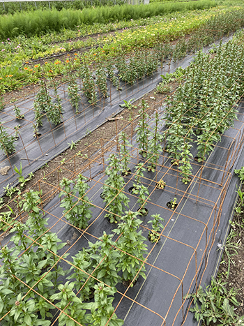 Metal support cages and pre-burned landscape cloth aid in snapdragon production.