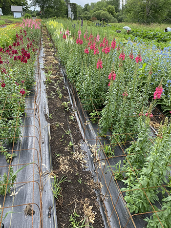 The 4-inch paperpots are perfect for the early season. Because we pack them in so tightly, I don’t have to worry if I didn’t get perfect germination or if some plants don’t make it. We do a pass or two with interchangeable-head wire weeders while the plants are small, then once the snapdragons fill in, their tight spacing helps to prevent weeds.
