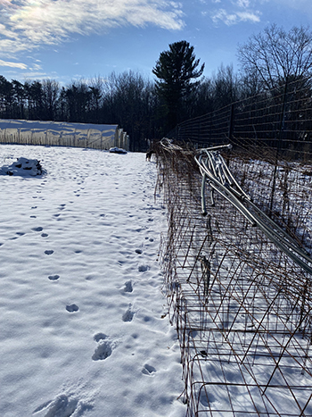 Concrete mesh cages stored along the fenceline in winter, with stored irrigation pipes on top.