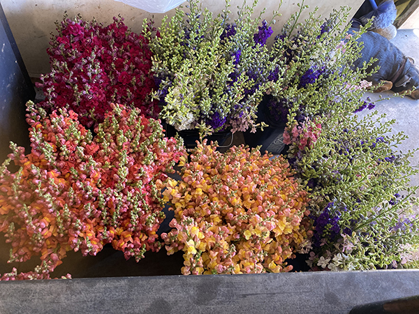 The dried snapdragons are also great dried flower bouquet material. I charge the same for my dried flower bouquets as my fresh to keep consistency with my customer base. We wrap dried bouquets with the same Kraft paper wrap and sticker with label and logo. I’ve also loved using the dried snapdragons in wreaths and other design work this winter. (See “How to dry flowers that come back from market,” from the February 2023 GFM or in the archives at growingformarket.com/.)