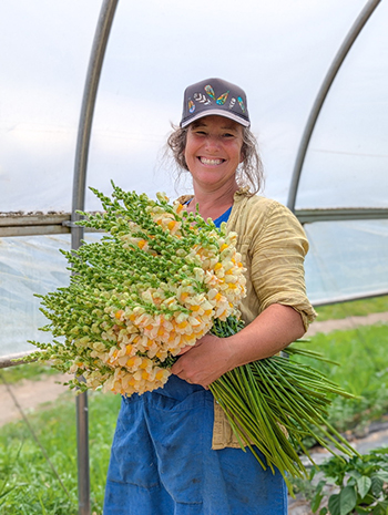 Author Corinne Hansch holding an armful of Avignon Apricot II snapdragons.