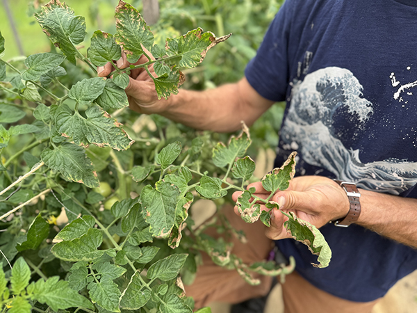 Hartman inspects leaf necrosis on the tomatoes treated with ASD. This may be caused by imbalanced soil nutrients.