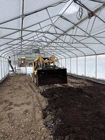Hartman uses a skid loader to spread new compost after removing the top 3-4 inches of infected soil in one of the greenhouses at Clay Bottom Farm. All photos courtesy of the author.