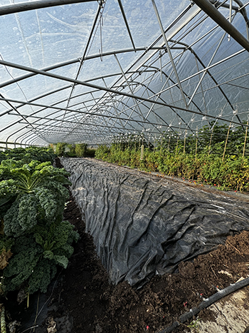For optimum results, the Ohio State factsheet recommends keeping the temperature inside at at least 85°F the whole time. Ben said it was hard to know if he achieved this. That fall, he planted the area in greens and noticed that weed pressure was reduced to near zero. But the real test came when tomatoes were planted in the spring.