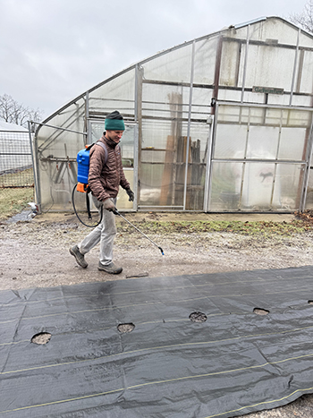 Then, we cleaned all the poles, stakes and other trellising equipment in a bath of Oxidate solution (you can also use hydrogen peroxide). To disinfect the ground cover, we spread it on the driveway and sprayed it with the same solution using a backpack sprayer. We also used the sprayer on the interior surfaces of the greenhouse (plastic walls and steel supports).