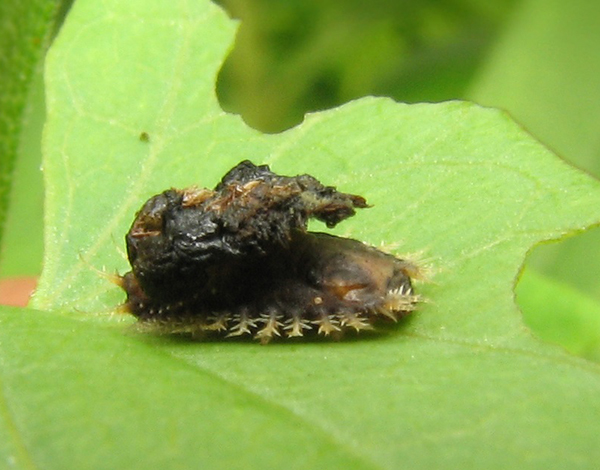 In northern states, both species of tortoise beetle are expected to produce only one generation per year. Development from egg to adult stage takes around six weeks for both species. After larvae pupate and emerge as adults, they will feed a little bit and then enter diapause — remaining inactive until the following spring. Further south however, both species may produce two or more generations in a season.