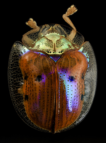 As the name suggests, tortoise beetles resemble miniature turtles, with their domed carapace. Though the adult beetles invite curiosity with their sometimes eye-catching colors, the larvae have an interesting defense mechanism that can be off-putting. Adult tortoise beetles lay their eggs on the undersides of leaves on host plants, where the larvae that hatch out protect themselves with a “fecal shield,” built upon their “anal fork,” which they can raise up against potential predators (Fig. 1).