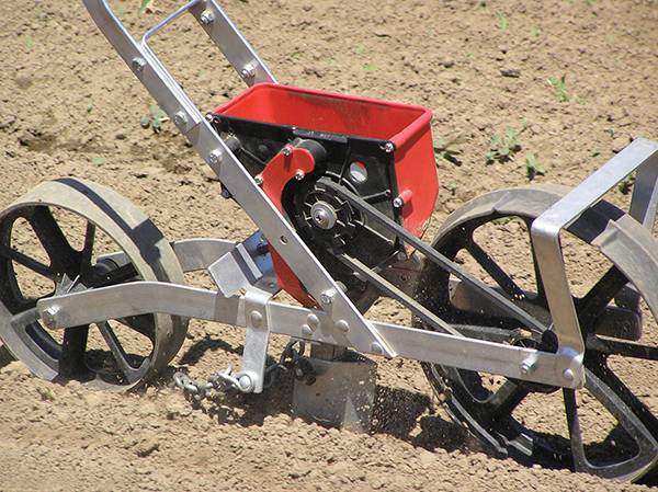The Earthway is also much lighter than other seeders, and this makes it easier to handle when it’s not seeding. On heavy ground and with rocks it will tend to jump around and not penetrate the soil well, so it doesn’t work for every farm. When I’ve wanted to seed peas deeply in early spring, when conditions are terrible for running a seeder, I’ve pre-opened a furrow with a hoe and then just pulled the furrower all the way up so that the seeder is just metering out the seed, not opening or closing the furrow at all. Even with small seed I’ve found that pre-forming a small furrow can help the seeder run more cleanly.