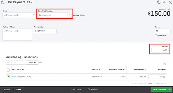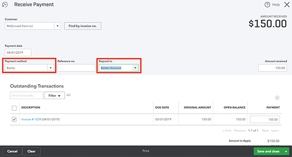 •If it were only partially paid through barter, say $100 worth of seconds tomatoes and the rest was due in cash, you would only enter $100 for now. You would then repeat this process but select the bank account you deposited the cash payment into.