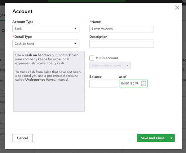 •Set up a new account. In the pop-up screen select Account Type, Bank; Detail Type, Cash on Hand; and name the account, “Barter Account.” You can add a description if it will help you remember the proper use of this account.