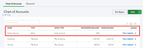 •When finished, select “Save and Close.” Your new “Barter Account” will now appear along with your other bank accounts in your Chart of Accounts.
