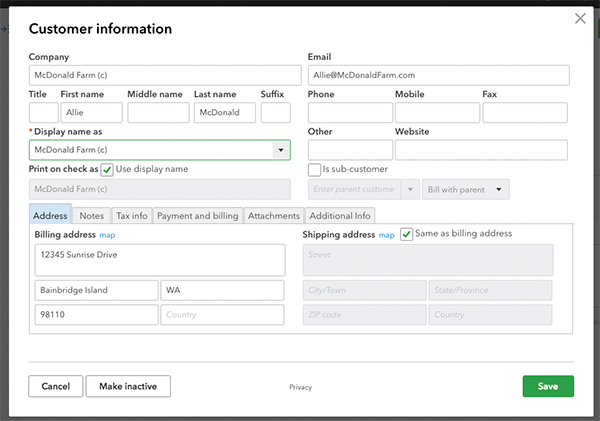 Because you will need to create both an invoice and a bill for the goods or services you provide and the goods or services you receive, you will need both a Vendor and a Customer account for the business you are trading with (in this example McDonald Farm). QuickBooks does not allow you to have a Vendor and a Customer with the same name, so you will need to differentiate between the two with a (v) and (c) in the display name.